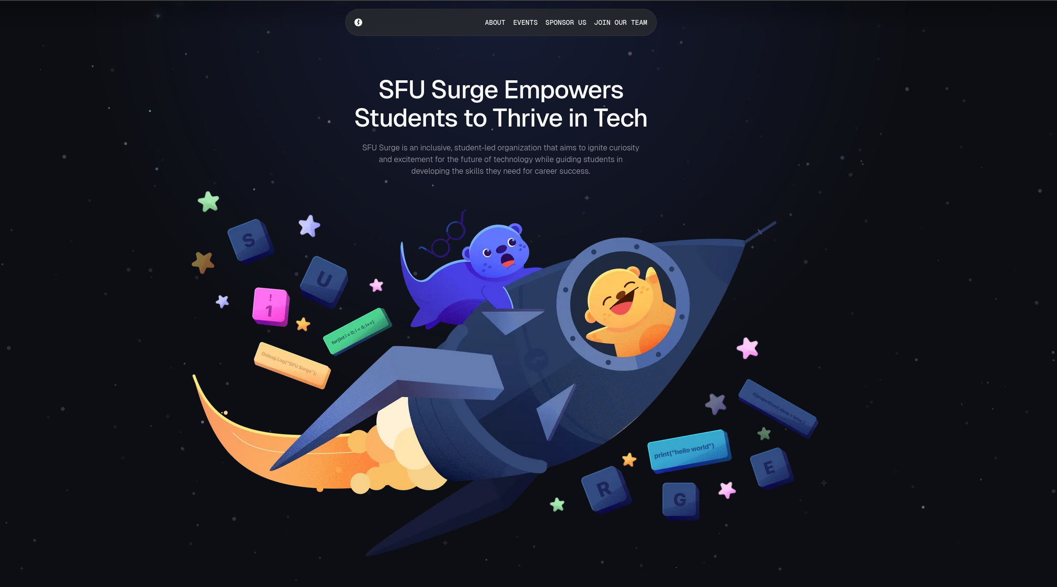 Main promotional website for SFU Surge, An all-inclusive club designated to empower students for success in the tech industry