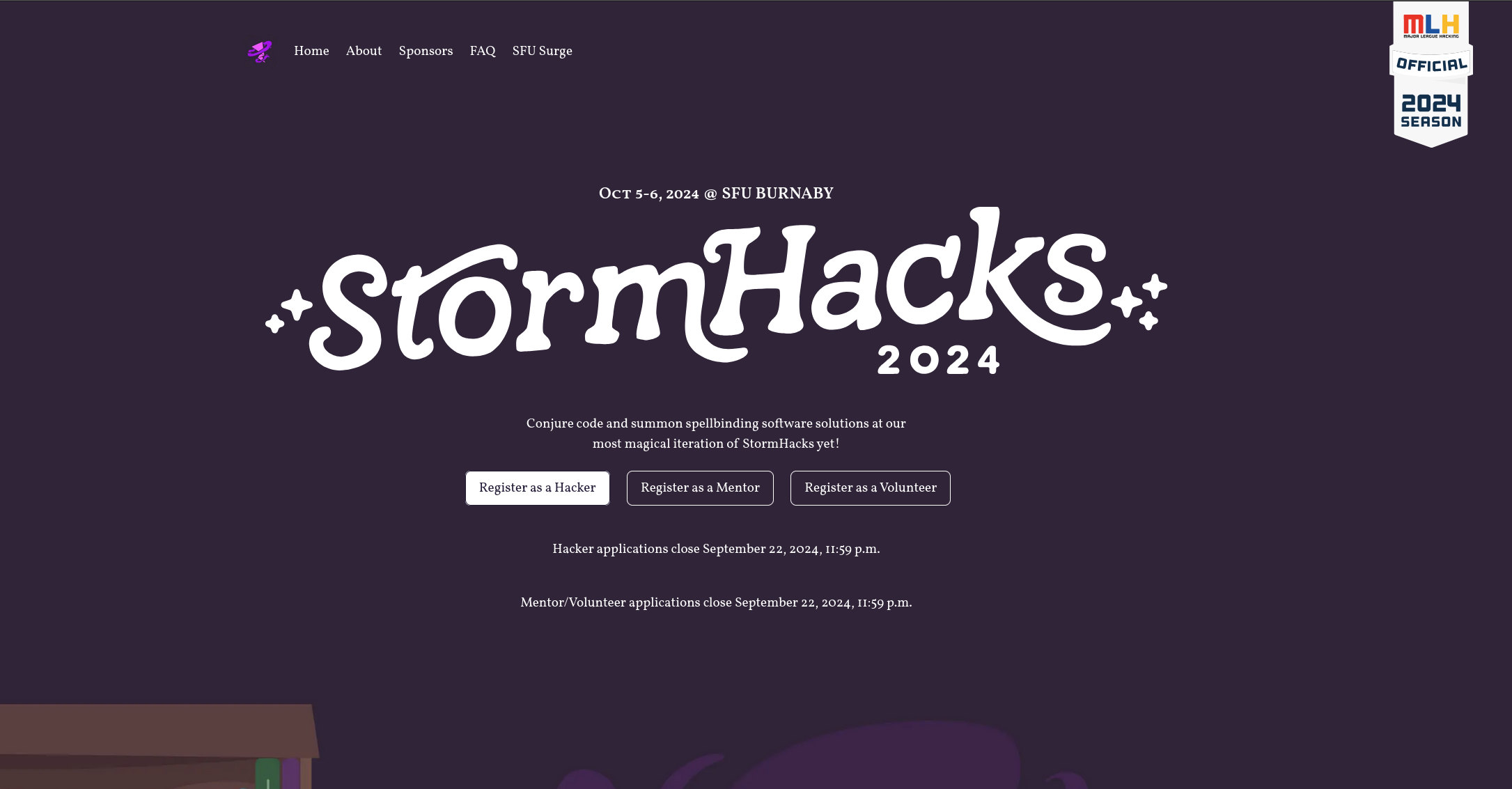 Main promotional website for Stormhacks, Simon Fraser University's largest MLH-accredited hackathon